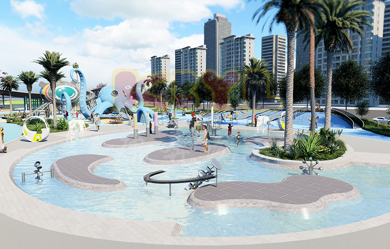 樂園附有一條蜿蜒的小溪,孩子、成年人和老年人可在這欣賞水景。這條小溪沿線有許多密集的長凳和科普類型的游樂設施,如阿基米德取水器、壓水槍、互動水渠等,朝向動線步行空間,還種植樹木提供陰涼...
